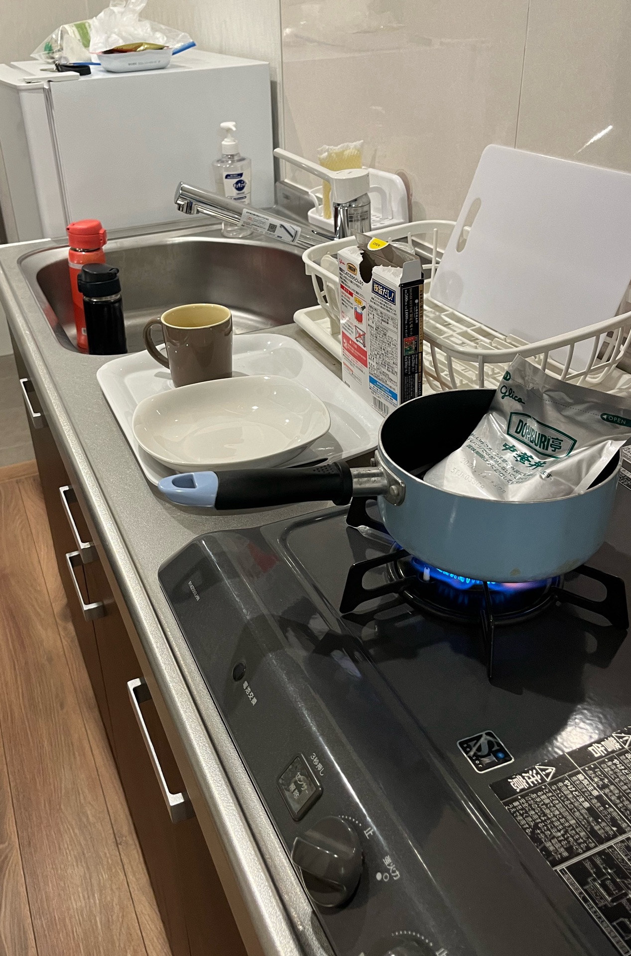 部屋に電子レンジやガスコンロ、洗濯機や乾燥機までありかなり便利!
